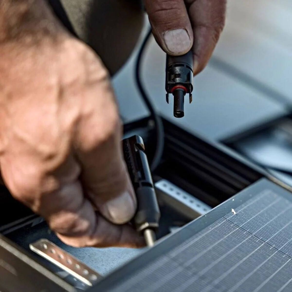 Die Panele werden in einer Reihenschaltung (MC4, gemäß IEC 62852) zu